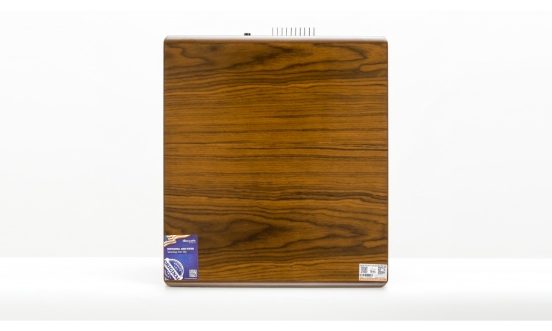 Vỏ thùng được chế tạo bằng gỗ cao cấp, mặt trước là tấm ê căng bảo vệ củ bass bên trong. Ở ngay trên củ bass cũng được in logo thương hiệu. Đây mới là điểm ấn tượng của loa. Logo màu trắng nổi bật trên màng loa màu đen. Gân loa bằng cao su to và chắc chắn.